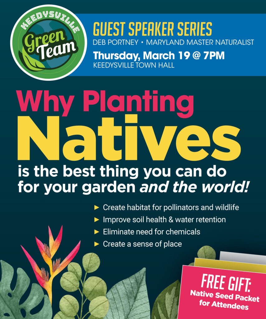 Why planting NATIVES is the best thing you can do for your garden—and the world! The Green Team’s guest speaker, Deb Portney, will discuss how native plants create habitat for pollinators and wildlife, improve soil health & water retention, eliminate need for chemicals, and create a sense of place. Free native seed packets for attendees!